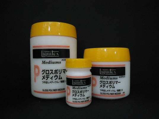 リキテックスカラーに混ぜると、光沢と透明感が増します。乳白色ですが、乾くと透明になります。接着力が強いのでコラージュの接着剤にもなります。